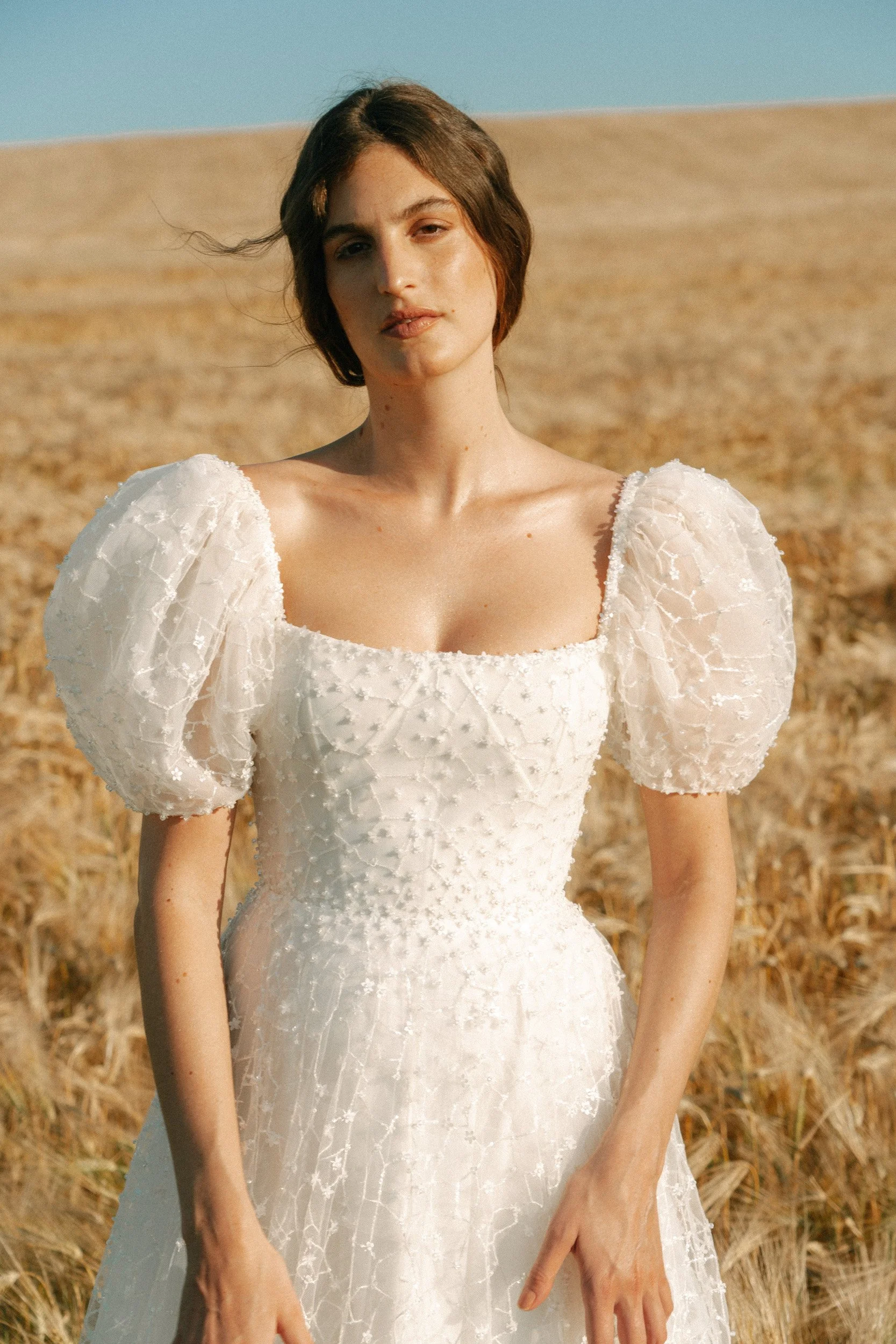 The Escallonia gown is lavishly scattered with sparkling handcrafted flowers, complemented by detachable puffed sleeves. Add the sleeves to create a dreamy touch, or remove them later for a second look on your day. The beading goes all the way down the skirt to create a fascinating element of light and shimmer when moving. The bare back adds a dramatic reveal where one expects it the least.